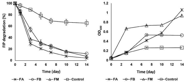 Enterobacter sp. (FA) und Brucella sp. (FB) → spezialisiert auf den Abbau von Fipronil